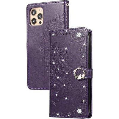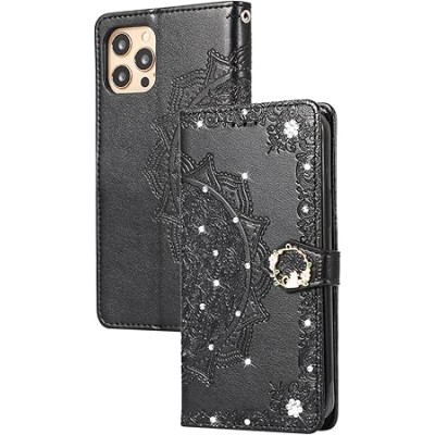 Wallet Case for iPhone 15 Pro Max/15 Plus/15 Pro/15, Shining Women's Phone Cover Mandala Flower Relief Leather Flip Case