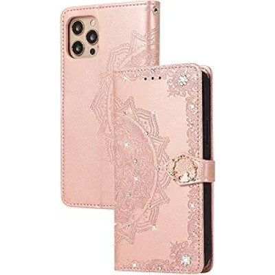 Wallet Case for iPhone 15 Pro Max/15 Plus/15 Pro/15, Shining Women's Phone Cover Mandala Flower Relief Leather Flip Case