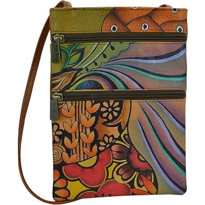 Women’s Hand Painted Genuine Leather Mini Double Zip Travel Crossbody - Magnetic Closure, ID Holder & Optical Case
