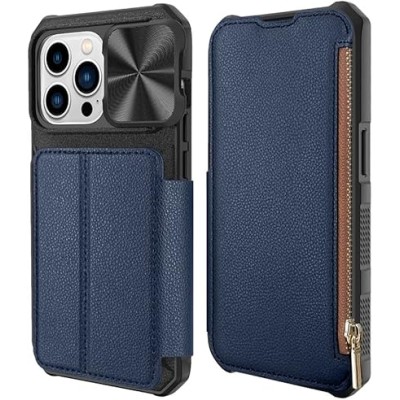 Leather Flip Zipper Wallet Slide Camera Lens Protector Phone Case for iPhone 14 Pro Max Plus Hybrid Bumper Shockproof Card